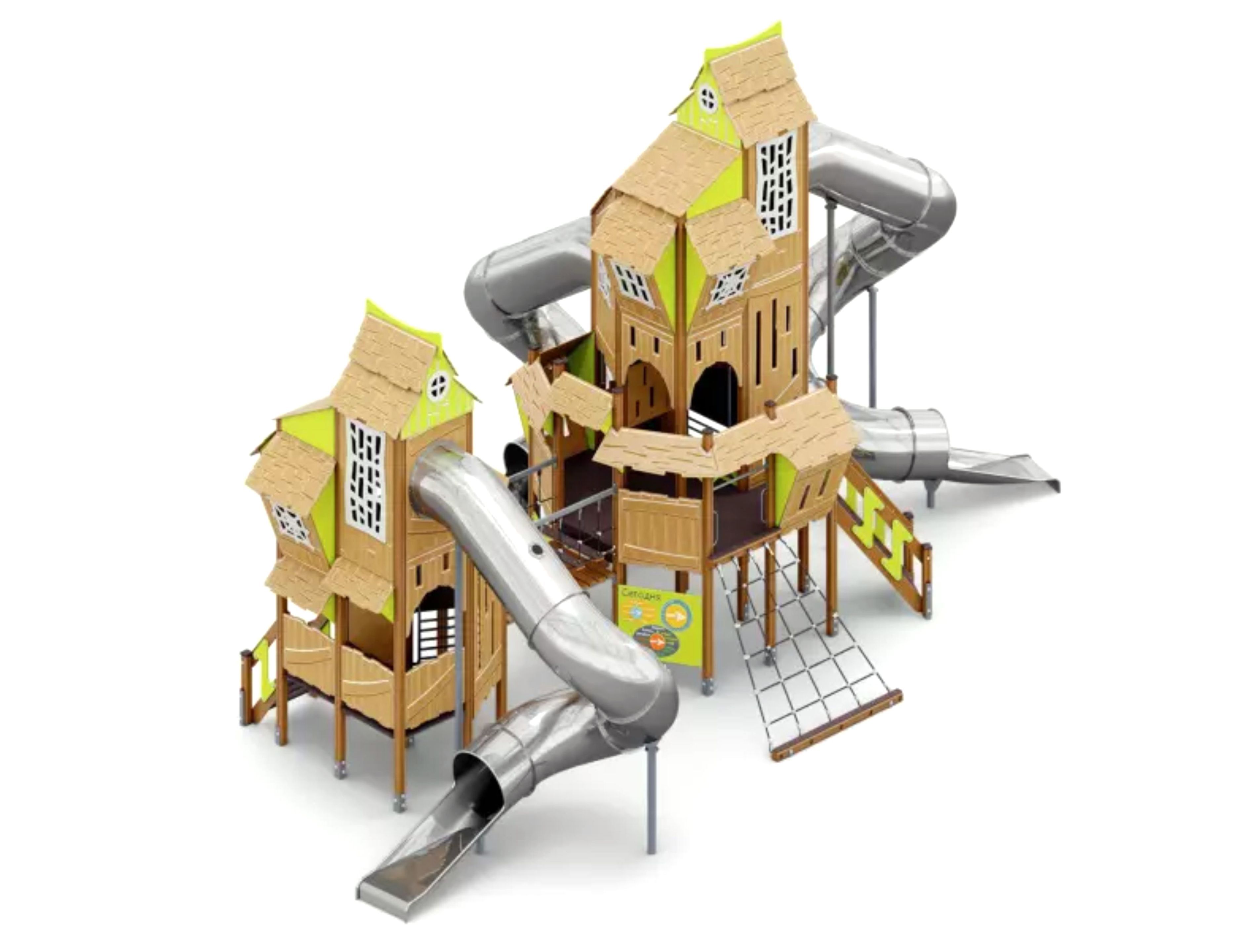 Состав комплекса очень разнообразен. Внизу комплекса установлены бизиборды «Календарь» и «Геометрические фигуры». На сам комплекс можно подняться двумя способами: традиционно по лестнице, а также по канатному трапу. Внутри сделаны вертикальные лестницы-подъёмы. И ключевая особенность комплекса – здесь есть закрученные горки-туннели из нержавеющей стали со специальными световыми окошками, которые неизменно привлекают активных детей.