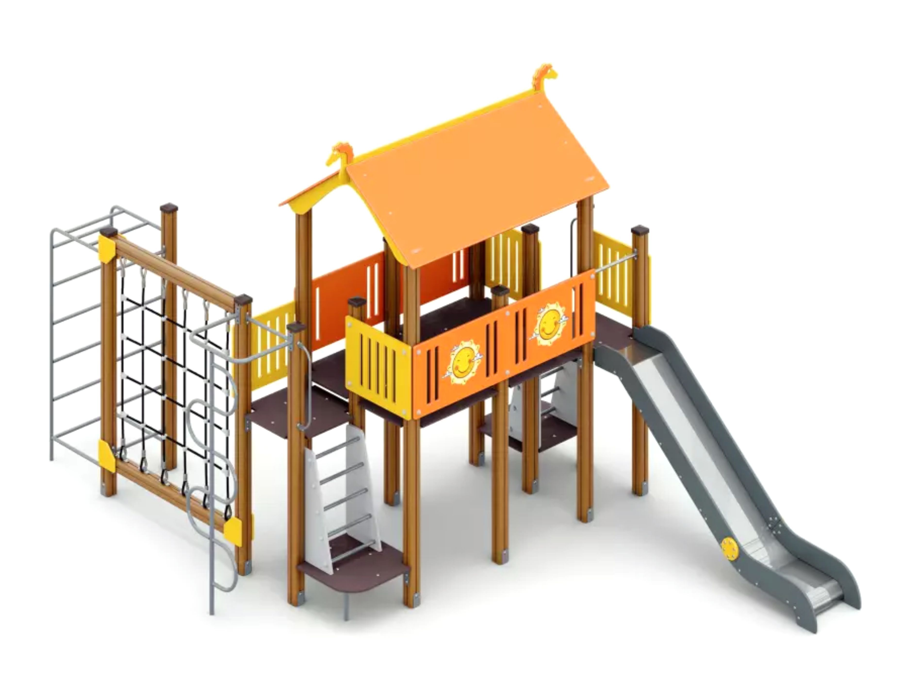 Игровой комплекс «Витязь» разработан для детей в возрасте от 5 до 12 лет. Детская площадка включает в себя большую башню с крытой площадкой для игр, где детям будет комфортно даже во время дождя. Подняться на площадку можно по обычной лестнице, рукоходу, вертикальной змейке или канатной сетке, а спуститься – скатившись с металлической горки (h-1200). Все элементы комплекса безопасны и создают комфортное пространство для детей и их активного отдыха. Оборудование станет прекрасным дополнением игровой зоны на территории двора, школы, стадиона, городского парка или сквера.