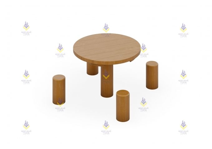 В набор входит стол и четыре стульчика-столбика. При изготовлении применяется натуральное дерево - лиственница. Лаконичный дизайн также входит в список преимуществ: модель красиво смотрится и легко вписывается в натуральный ландшафт.