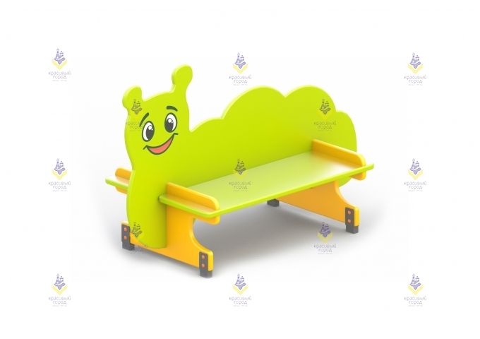 Размеры и оформление скамьи созданы специально для детей. Сидение располагается на комфортном уровне, есть украшение с принтом веселой гусеницы. Такие скамейки часто заказывают для уличного благоустройства детских дошкольных учреждений.